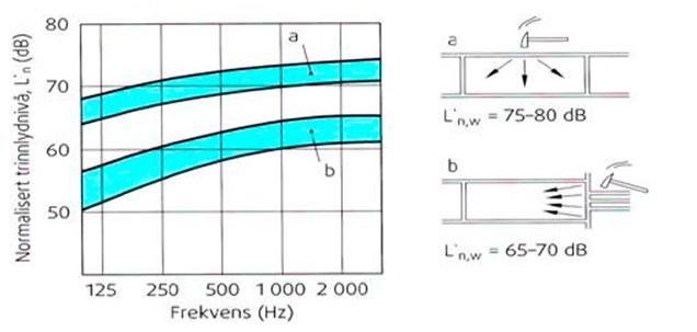 | Trinnlyd i betongtrapp uten lydreduserende tiltak (fra Byggforskserien 532.241) | |