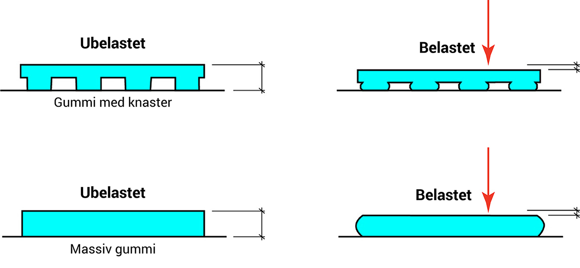 Vår erfaring for god trinnlydsdemping, er at man må bruke en myk gummi f.eks. 58 shore :